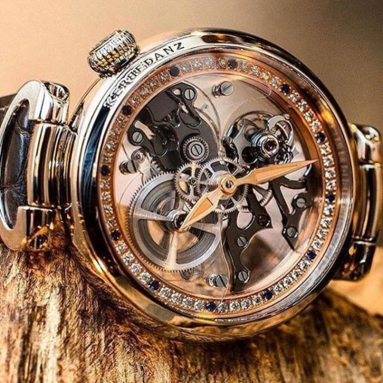 Компания KERBEDANZ использует высокотехнологичные свойства этого бесцветного и прозрачного материала, чтобы подчеркнуть микромеханическую красоту своего калибра KRB-02 — мануфактурного турбийона, разработанного, изготовленного и декорированного самой компанией в сотрудничестве с Concepto: 19 камней, 21 600 колебаний в час, запас хода 72 часа, 168 деталей, турбийонная клетка из 80 деталей весом 0,42 грамма.