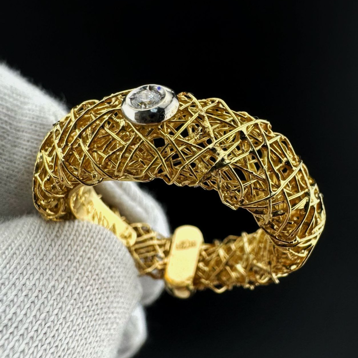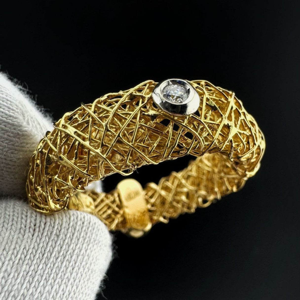 Оригинальное кольцо выполнено из жёлтого золота 750 пробы